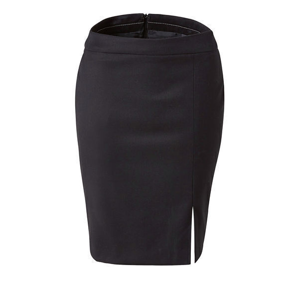 Jupe fermeture zippée dos. Découpe et fente devant, 1 poche italienne côté gauche, 1 poche passepoilée dos avec ruban gros grain, pinces dos. Entièrement doublée. Coupe droite.