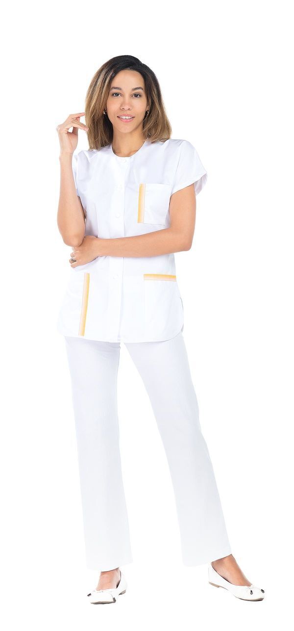 Tunique femme. Fermeture milieu devant par boutons-pression. 2 poches basses. Poche poitrine avec ruban décoratif. Manches courtes kimono. Bas forme liquette. Fentes côtés. Longueur : 75 cm.