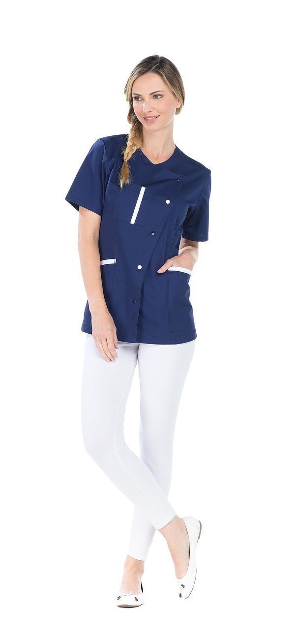 Tunique femme. Encolure V. Fermeture asymétrique par boutons-pression contrastées. Poche poitrine avec compartiment stylo, 2 poches basses. Manches courtes. Longueur : 75 cm.