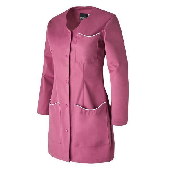 Tunique femme. Encolure fantaisie ton sur ton. Fermeture milieu devant par 5 pressions ton sur ton. 2 poches basses plaquées avec passepoil contrasté. Manches transformables. Coupe cintrée. Longueur : 80 cm.