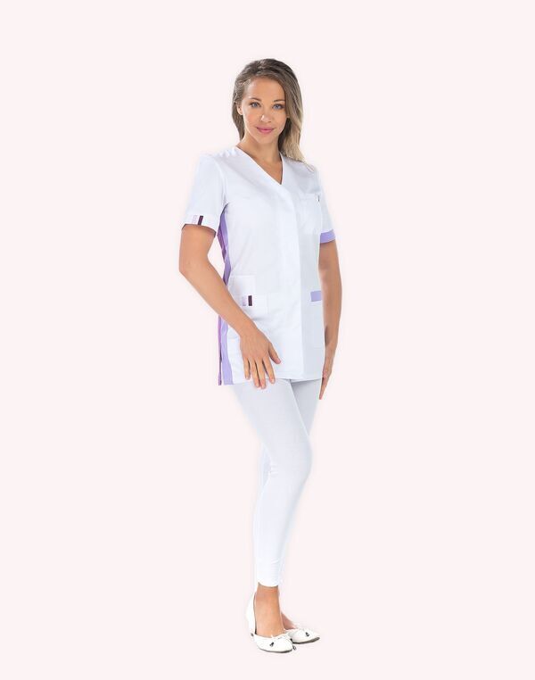 Tunique femme. Col V. Fermeture milieu devant par boutons-pression. Poche poitrine passepoilée, poche BIP, 2 poches basses et 2 fentes. Manches courtes. Empiècements contrastés aux côtés, poches et bas de manches. Longueur : 75 cm.