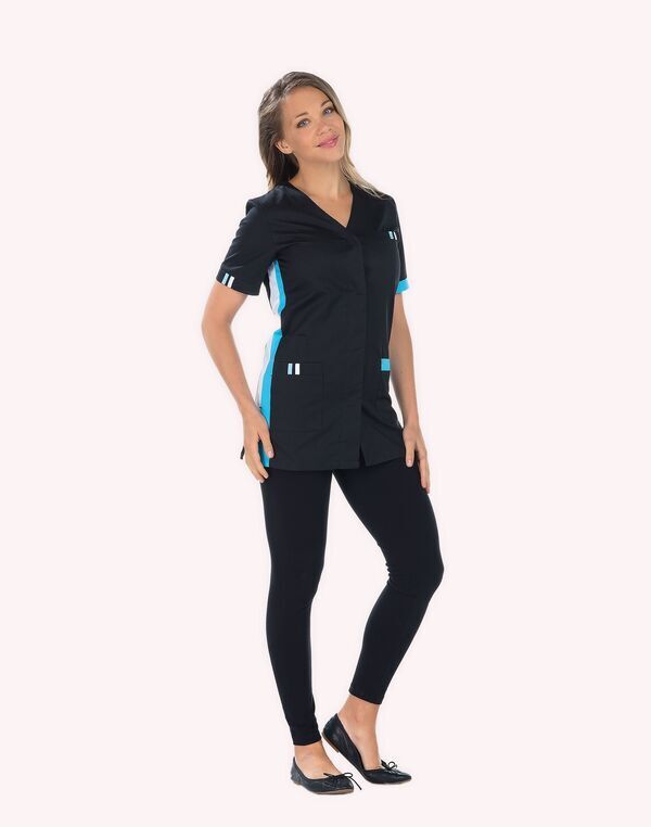 Tunique femme. Col V. Fermeture milieu devant par boutons-pression. Poche poitrine passepoilée, poche BIP, 2 poches basses et 2 fentes. Manches courtes. Empiècements contrastés aux côtés, poches et bas de manches. Longueur : 75 cm.