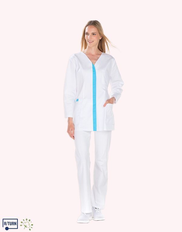 Tunique encolure V. Fermeture milieu devant par boutons-pression, parement contrasté. Découpe de cintrage. Poche poitrine, poche BIP. 2 poches basses semi-volantes. 2 fentes dos. Longueur : 75 cm.
