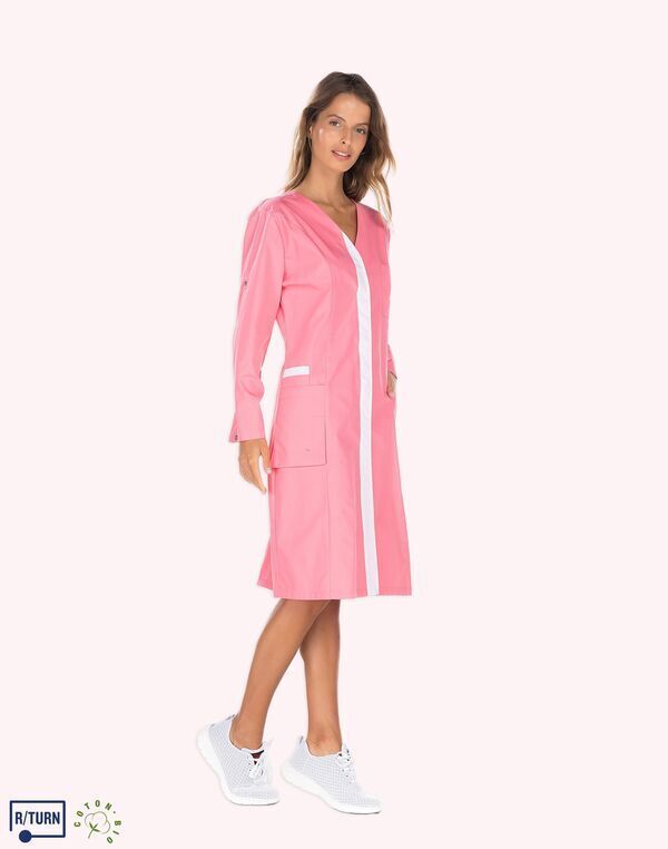 Tunique encolure V. Fermeture milieu devant par boutons-pression, parement contrasté. Découpe de cintrage. Poche poitrine, poche BIP. 2 poches basses semi-volantes. 2 fentes dos. Longueur : 75 cm.