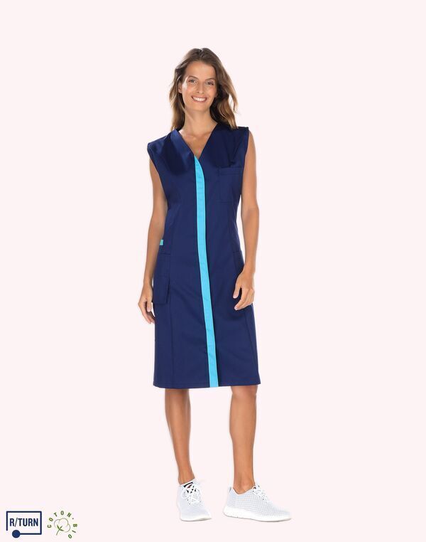 Tunique encolure V. Fermeture milieu devant par boutons-pression, parement contrasté. Découpe de cintrage. Poche poitrine, poche BIP. 2 poches basses semi-volantes. 2 fentes dos. Longueur : 75 cm.