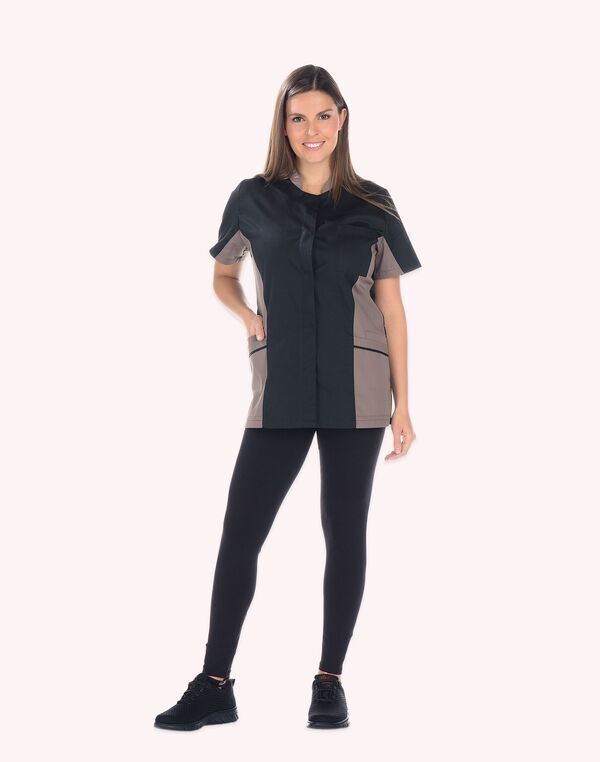 Tunique femme, col mao. Fermeture milieu devant par boutons-pression sous patte. Poche poitrine, 2 poches BIP, 2 poches basses dans découpe coté. Col et côtés contrastés. Manches courtes. Fentes cotés. Longueur : 75 cm.