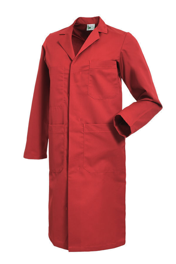 Blouse homme. Col tailleur. Fermeture milieu devant par boutons-pression sous patte. Poche poitrine. 2 poches basses. Manches longues. Longueur : 100 cm.