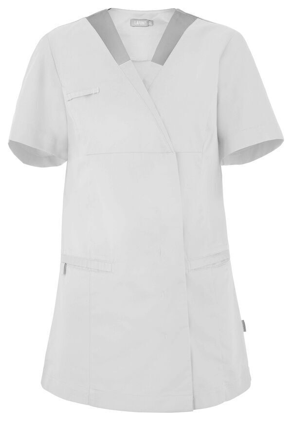 Tunique . Encolure V contrastée, collerette de marquage intérieur. Fermeture croisée par grippers cachés. Découpes princesses. Poche poitrine passepoilée. 2 poches basses passepoilées. Passant porte-badge. Manches courtes. Longueur : 75 cm.
